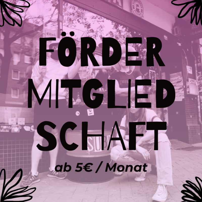 Ihr holt euch bei uns im Subrosa oder hier Antrag auf Fördermitgliedschaft ein Antragsformular und gebt es uns ausgefüllt wieder zurück. Ihr könnt es bei eurem nächsten Besuch persönlich abgeben oder via Mail (subrosa1995@riseup.net) oder per Post (Elisabethstraße 25 in 24143 Kiel) zu schicken. Für euren Beitrag richtet ihr einen Dauerauftrag ein. Ihr übernehmt keine weiteren Verpflichtungen für den Verein und seid nicht stimmberechtigt.