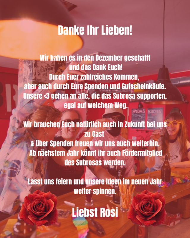 Im Moment ist an manchen Tagen nämlich viel zu wenig los. Kommt vorbei, wenn ihr wollt, dass das Subrosa auch noch die nächsten 30 Jahre für euch und uns da ist. Wir brauchen euch.